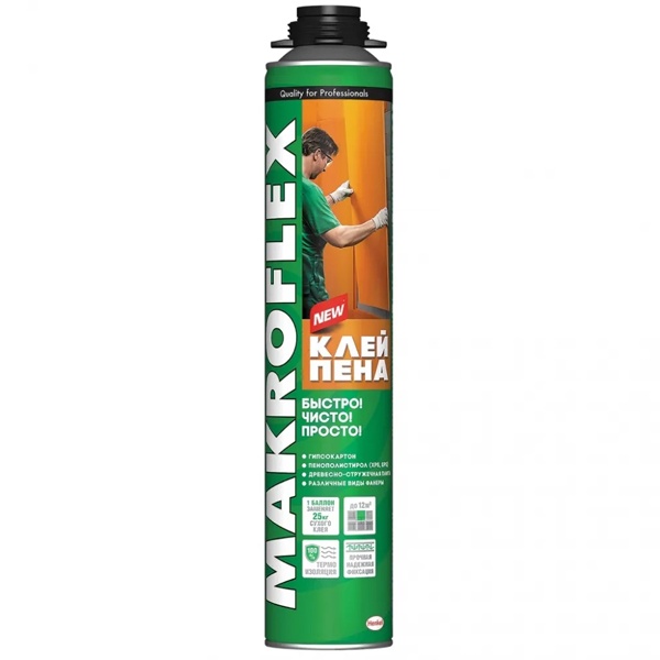 Готовая к употреблению сверхэффективная универсальная расширяющаяся клей-пена для быстрой фиксации изозяционных панелей к фасадам и фундаментам, панелей внутренней отделки к стенам, установки подоконников. Благодаря этому инновационному продукту больше не понадобятся тяжелые мешки, дополнительное оборудование, вода и энергия; больше не будет пыли и грязи, длительной работы по очистке и других поглощающих время работ. Клей-пена позволяет выполнить работу значительно меньшими усилиями и помогает вдвое сократить затрачиваемое на работу время.