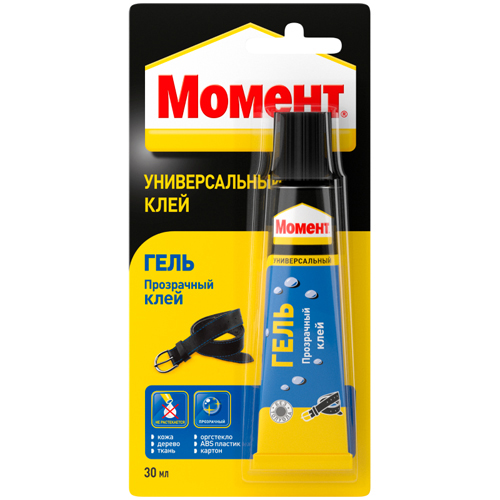 Момент Гель - универсальный контактный клей в виде геля, не растекается на вертикальных поверхностях и подходит для пористых поверхностей. Области применения Момент Гель- прозрачный гелеевый клей, не оставляющий заметных следов. Предназначен для работы с пористыми и впитывающими материалами. В различных сочетаниях склеивает дерево, металл, резину, бумагу, картон, кожу, ткань, пробку, поролон, фарфор, керамику, стекло, кроме посуды, конактирующей с пищей. Цвет Прозрачный Основа Полиуретан Вес, объем 30мл.